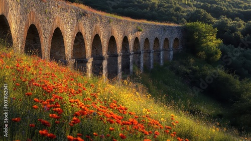 Panoramic shot of aqueduct following hillside contour bright wildflowers contrasting with warm light and weathered stone arches