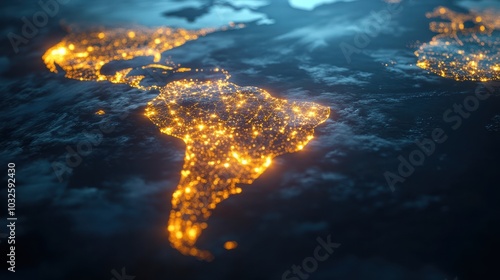This visual illustrates a world map with illuminated pathways connecting major cities in Latin America, symbolizing the extensive reach of digital marketing services across the region