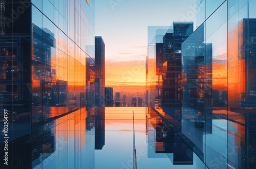 This abstract view of a city skyline, featuring sleek glass high rises illuminated by sky colors, evokes a sense of modernity and urban progress