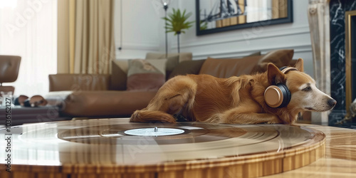 Elegancki golden retriever leży na lśniącym gramofonie, słuchając muzyki w słuchawkach. W tle luksusowy salon z sofą i kominkiem.