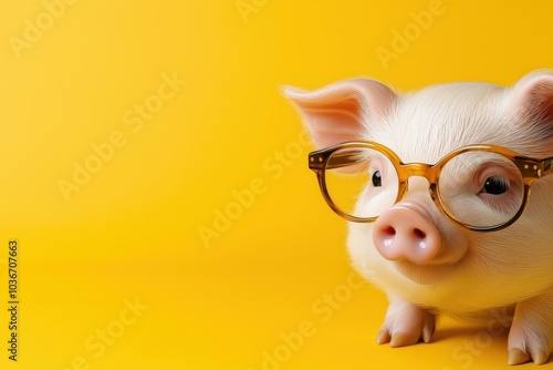 A clever little piglet wearing stylish glasses against a vibrant yellow backdrop. Generative AI
