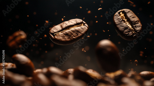 Kompozycja przedstawiająca ziarna kawy w różnych kształtach i rozmiarach, w centrum której znajduje się elegancka filiżanka z aromatyczną kawą.