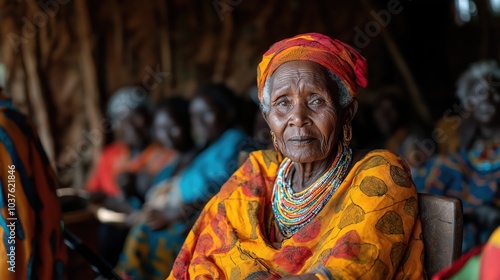 An elderly Kenyan woman leads a vibrant community business meeting, sharing wisdom and fostering collaboration among local members