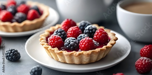 A delicious berry tart with raspberries and blackberries, served on a plate with coffee.
