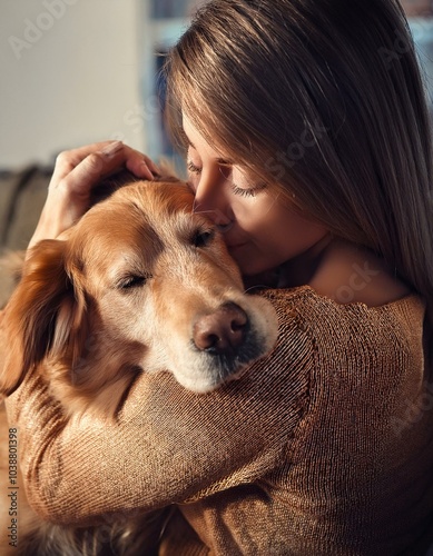 chien dans les bras de sa maitresse pour un câlin dans un salon, image ia adoption