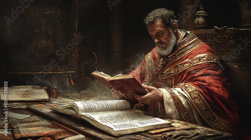 Saint Augustine of Hippo is portrayed in a timeless artistic style, enveloped by ancient manuscripts that embody his profound philosophical insights.