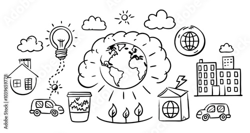 environment infographic, sketch globe light bulb, problem solution strategy solving plan