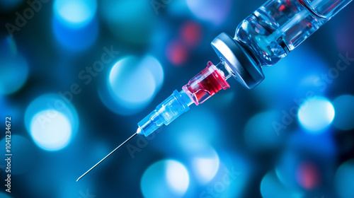 Strzykawka medyczna w zbliżeniu, wypełniona jasnym płynem szczepionki, gotowa do podania. Igła błyszczy w świetle, podkreślając precyzję narzędzia.