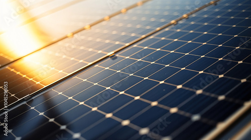 Blue photovoltaic solar panels mounted on building roof for producing clean ecological electricity at sunset. Production of renewable energy concept.
