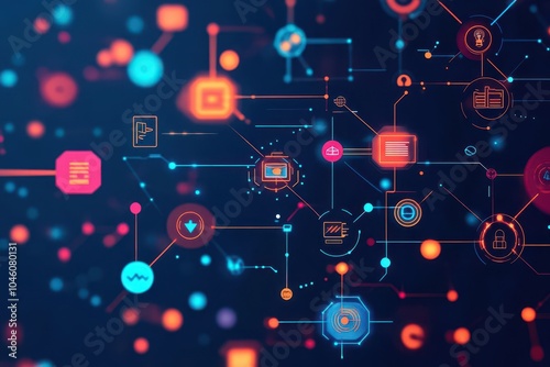 Abstract tech mesh network in a flat design, top view, automation theme, cartoon drawing, Splitcomplementary color scheme