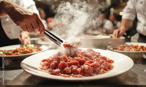 A chef uses tongs to serve a steaming plate of thinly sliced beef.