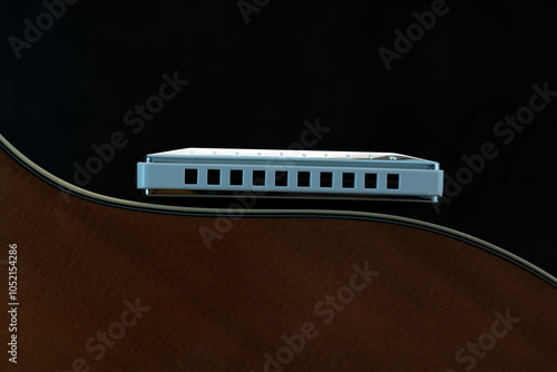Macro close up diatonic harmonica lying on side of guitar body showing the curve of the guitar body