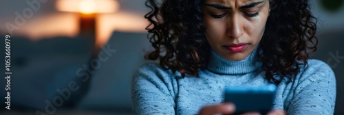 Woman looking down at phone in dim light, sitting on couch