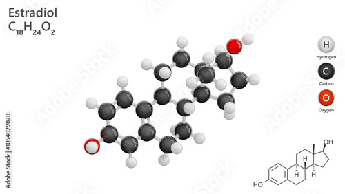 Molecule: Estradiol or Oestradiol. Estrogen steroid hormone. Molecular structure. Formula: C18H24O2. Chemical model: Ball and stick. White background. 3D illustration.