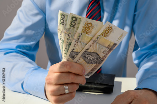Polska gotówka pln wachlarz trzymany w rękach eleganckiego mężczyzny