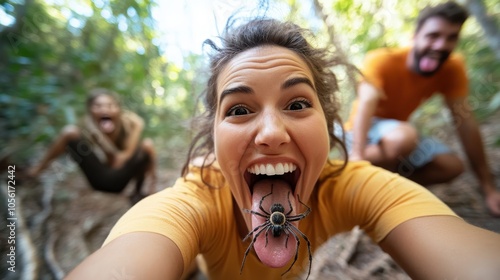 A woman poses with a spider perched on her tongue, while two people make funny faces in a lush jungle setting, capturing a moment of daring fun.