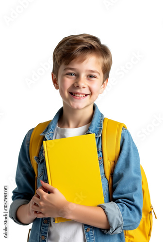 Criança menino estudante sorridente com livro amarelo em fundo transparente 3