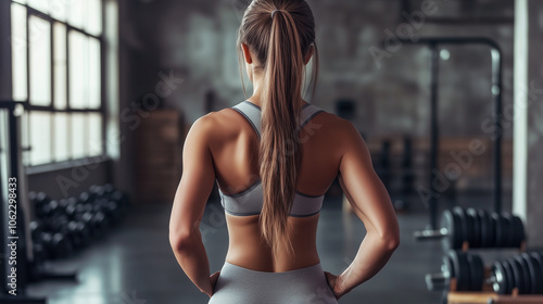 Młoda kobieta w obcisłych szarych legginsach fitness, z widokiem od tyłu, emanuje pewnością siebie i energią.