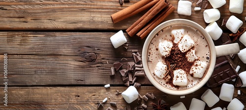 Rustic Hot Chocolate with Marshmallows and Cinnamon Sticks on Wooden Table - Cozy Winter Beverage