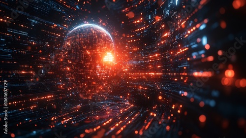 Artificial intelligence entity encircled digital data and protective shields symbolizing AIs role in threat prediction and cybersecurity