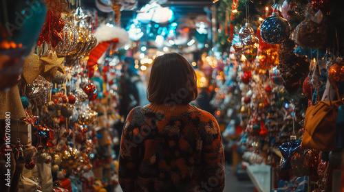 Kobieta z tyłu, która przegląda kolorowe ozdoby świąteczne w wąskim sklepie.