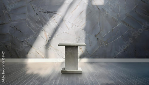 The walls made of gray-toned marble in the sunlit room and the podium with a refined modern feel.