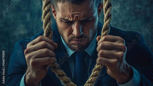 Smutny biznesmen z wyrazem niemal płaczącym na twarzy, trzymający w rękach linę. Jego zrezygnowana postawa i ciężar chwili oddają głębokie uczucia depresji i bezsilności.