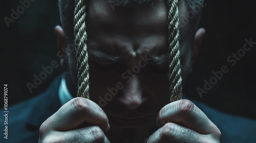 Smutny biznesmen z wyrazem niemal płaczącym na twarzy, trzymający w rękach linę. Jego zrezygnowana postawa i ciężar chwili oddają głębokie uczucia depresji i bezsilności.