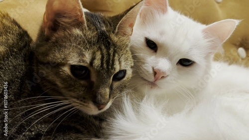 Cute domestic cats lying on sofa at home. Portrait of beautiful striped and white kittens indoor. Family couple feline resting together. Concept of adorable animals. Close up