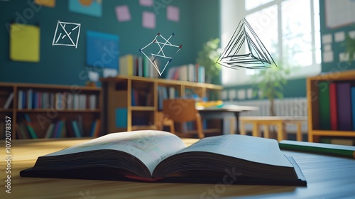 A 3D math book on a school desk with floating 2D trigonometry symbols, symbolizing advanced math studies, 4k resolution, ultra-realistic, uncluttered background