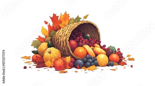 a 2D cartoon illustration of a Thanksgiving cornucopia filled with fruits and vegetables, abundant and warm, white background--ar 16:9