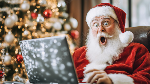 Święty Mikołaj, siedząc przy biurku, zaskoczony przegląda listę prezentów na komputerze, w której znajdują się bardzo drogie podarunki.