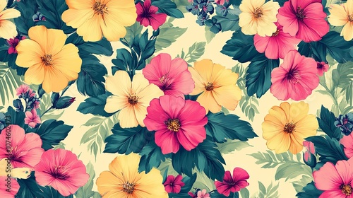 Tropical seamless pattern featuring floral and palm leaves in teal, pink, and yellow on a cream background, perfect for spring/summer dress prints. Hand-drawn multicolored wildflower motif.