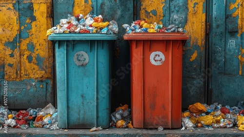 close-up of a brightly colored recycling bin beside a traditional garbage bin, both overflowing with mixed waste, emphasizing the importance of recycling and environmental responsibility