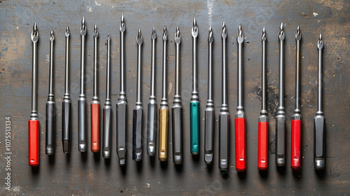 Zestaw śrubokrętów ułożonych na stole, z wyraźnie widocznymi różnymi typami końcówek.