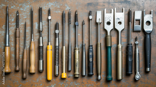 Zestaw śrubokrętów ułożonych na stole, z wyraźnie widocznymi różnymi typami końcówek.