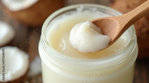 Close-up of a jar of coconut oil with a wooden spoon scooping a small amount, smooth, creamy texture, glossy surface, fresh coconut pieces in the background, soft natural lighting