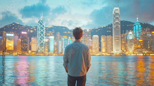 Expat walking home from work, admiring city lights, reflection on life abroad