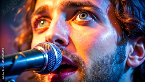 Músico apasionado actuando en el escenario, mostrando una conexión emocional a través de ojos expresivos y detallados.
