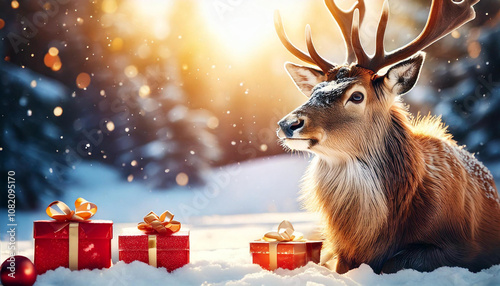 Renifer leżący na śniegu obok czerwonych pudełek z prezentami. Bożonarodzeniowe tło