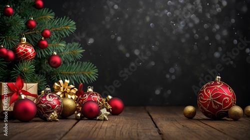 Festive Christmas tree with decorations, baubles, and ornaments in red and gold, celebrating the holiday season