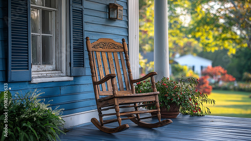 Rustic Porch Serenity: A weathered rocking chair on a classic blue porch, bathed in the warm glow of morning sunlight, inviting relaxation and reflection.