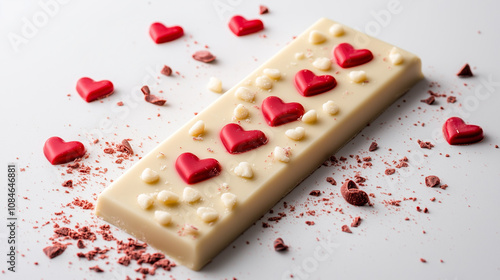 Biała czekolada z drobnymi, czerwonymi serduszkami jako dekoracją, łącząca subtelną słodycz z eleganckim, miłosnym motywem. Idealny deser na Walentynki lub inne romantyczne chwile.