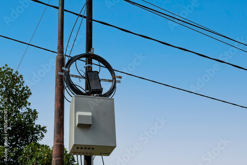Telecommunications equipment mounted on a utility pole in a suburban area under a clear blue sky during the day