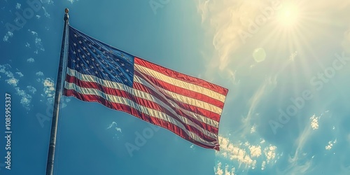 View of the United States Capitol dome with American flag waving on a sunny day in Washington, D.C