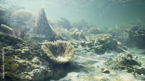 Ancient Cambrian Ocean Floor Teeming with Life - Ultra-Detailed 3D Render of Diverse Marine Ecosystem with Sponges and Corals