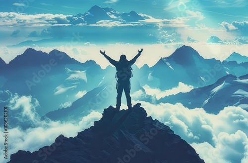Climber Triumphantly Stands Atop Majestic Mountain Peak