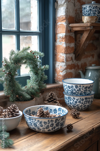 Kilka ceramicznych misek w niebieskie wzory, postawione na blacie