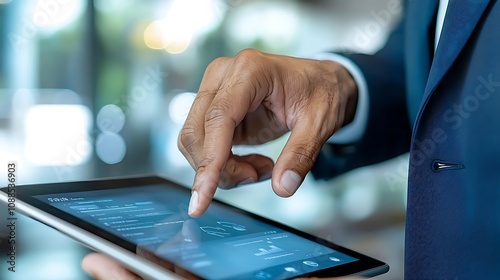 Closeup view of a businessman s hand touching and interacting with a digital tablet device in a modern corporate office setting showcasing technology data and business management concepts