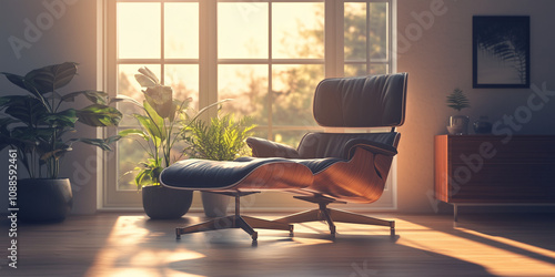 Stylowy fotel w minimalistycznym stylu, kąpiący się w ciepłych promieniach słońca, stoi w przytulnym wnętrzu, tworząc idealne miejsce do relaksu.